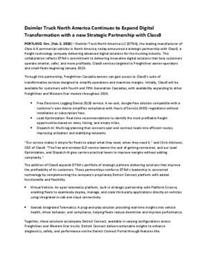 PORTLAND, Ore. (Feb. 2, 2026) — Daimler Truck North America LLC (DTNA), the leading manufacturer of Class 6-8 commercial vehicles in North America, today announced a strategic partnership with Class8, a freight technology company delivering advanced digital solutions for the trucking industry. This collaboration reflects DTNA’s commitment to delivering innovative digital solutions that help customers operate smarter, safer, and more profitably. Class8 services targeted to Freightliner owner-operators and small fleets beginning January 2026.