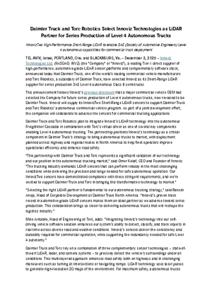 TEL AVIV, Israel, PORTLAND, Ore. and BLACKSBURG, VA. – (December, 2, 2025) — Innoviz Technologies Ltd. (NASDAQ: INVZ) (the "Company" or "Innoviz"), a leading Tier-1 direct supplier of high-performance, automotive-grade LiDAR sensor platforms and complementary software stack, announced today that Daimler Truck, one of the world’s leading commercial vehicle manufacturers and Torc Robotics, a subsidiary of Daimler Truck, have selected Innoviz as its Short-Range LiDAR supplier for series production SAE Level 4 autonomous Class 8 semi-trucks.