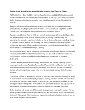 “Michelle demonstrates exceptional energy, determination, and a strong capability to drive meaningful transformation,” said Eva Scherer, Chief Financial Officer of Daimler Truck AG. “Her established leadership and comprehensive knowledge of our industry give me full confidence that she will deliver significant impact in her new role and help advance our North American business.”