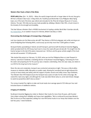 PORTLAND, Ore. (Oct. 14, 2025) — When the world’s largest aircraft no longer takes to the air, they get a lift from a Western Star truck. In May 2025, the 76,000-pound World War II-era Philippine Mars flying boat, one of the last of its kind, was retired and relocated to the Pima Air & Space Museum in Tucson, Arizona. The epic 150-mile journey was made possible by utilizing a Western Star 49X, a truck known in the industry for its strength and durability.