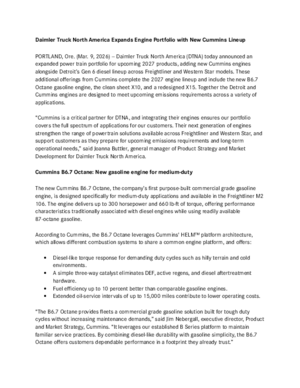PORTLAND, Ore. (Mar. 9, 2026) – Daimler Truck North America (DTNA) today announced an expanded power train portfolio for upcoming 2027 products, adding new Cummins engines alongside Detroit’s Gen 6 diesel lineup across Freightliner and Western Star models. These additional offerings from Cummins complete the 2027 engine lineup and include the new B6.7 Octane gasoline engine, the clean sheet X10, and a redesigned X15. Together the Detroit and Cummins engines are designed to meet upcoming emissions requirements across a variety of applications.