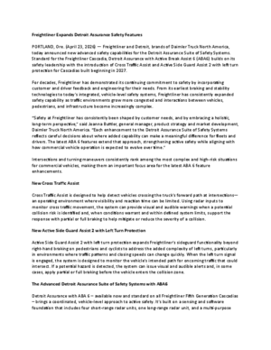 PORTLAND, Ore. (April 23, 2026) — Freightliner and Detroit, brands of Daimler Truck North America, today announced new advanced safety capabilities for the Detroit Assurance Suite of Safety Systems. Standard for the Freightliner Cascadia, Detroit Assurance with Active Break Assist 6 (ABA6) builds on its safety leadership with the introduction of Cross Traffic Assist and Active Side Guard Assist 2 with left turn protection for Cascadias built beginning in 2027.