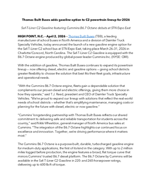 HIGH POINT, N.C. (April 2, 2026) — Thomas Built Buses (TBB), a leading manufacturer of school buses in North America and a division of Daimler Truck Specialty Vehicles, today announced the launch of a new gasoline engine option for the Saf-T-Liner C2 school bus at STN Expo East, taking place March 26–31, 2026 in Charlotte/Concord, North Carolina. The Saf-T-Liner C2 Gasoline is equipped with the B6.7 Octane engine produced by global power leader Cummins Inc. (NYSE: CMI).