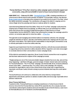 HIGH POINT, N.C. (Feb. 23, 2026) — Thomas Built Buses (TBB), a leading manufacturer of school buses in North America and a division of Daimler Truck Specialty Vehicles, has selected Bryan County Schools in Georgia as the recipient of proceeds from its recent ‘If You Pass’ school bus safety awareness campaign. The contribution will support the district’s ongoing work to reduce illegal school bus passings and improve roadway safety for students.