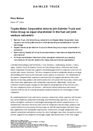 Leinfelden‑Echterdingen and Kirchheim u. Teck, Germany / Gothenburg, Sweden / Tokyo, Japan (March 31, 2026) — Daimler Truck AG (Daimler Truck), the Volvo Group (Volvo), cellcentric and Toyota Motor Corporation (Toyota) have signed a non-binding agreement to cooperate in the fuel cell system joint venture cellcentric. The three companies intend to collaborate based on an equal shareholding with Toyota as the third joint venture partner to cellcentric. The combination of the parties’ complementary experience and know-how will support and advance their joint objective to develop, produce and commercialise fuel cell systems for heavy-duty vehicles and other heavy-duty applications with comparable requirements. Additionally, Toyota and cellcentric intend to jointly manage the development and production of fuel cell unit cells — the core component of fuel cell systems — and directly linked architecture and control elements with the aim of creating competitive products based on the technologies of both companies.