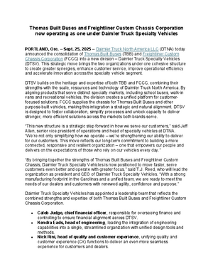 PORTLAND, Ore. (Sept. 25, 2025) — Daimler Truck North America LLC (DTNA) today announced the consolidation of Thomas Built Buses (TBB) and Freightliner Custom Chassis Corporation (FCCC) into a new division – Daimler Truck Specialty Vehicles (DTSV). This strategic move brings the two organizations under one cohesive structure to create greater synergies, enhance customer service, improve operational efficiency and accelerate innovation across the specialty vehicle segment.